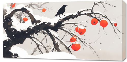 Obraz z serii motywy wschodnie zatytułowany Wschodnia Akwarela przedstawia zimowy krajobraz w stylu wschodnim. Drzewo o ciemnych, wyrazistych gałęziach pokrytych śniegiem wygina się elegancko na tle spokojnego, jednolitego tła. Na gałęziach znajdują się czerwone owoce, które mogą być symbolem persymonów lub innych zimowych owoców, kontrastujących swoim żywym kolorem z zimowym otoczeniem. Na jednej z gałęzi spoczywa czarny ptak, być może kruk, co dodaje życia i głębi kompozycji. Spadające płatki śniegu i subtelne odcienie w tle nadają scenie uczucie spokoju i ciszy. Ten obraz łączy prostotę z elegancją, mogąc stanowić wyrafinowaną dekorację w przestrzeniach szukających spokojnej, lecz wyrazistej estetyki.