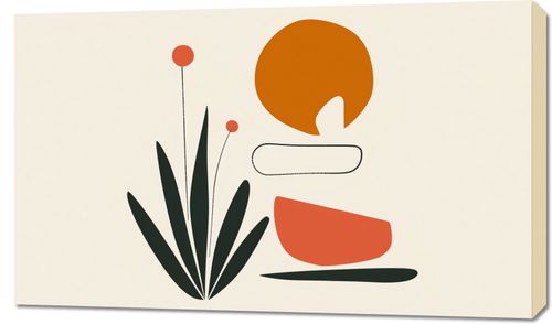 Obraz z serii boho zatytułowany Abstrakcyjny Zen. Kompozycja obrazu łączy prostotę z abstrakcją, przedstawiając zestaw harmonijnie zbalansowanych kształtów i form. Wyraźne, ciemnozielone liście tworzą bazę dla kompozycji, z której wyrastają dwa okrągłe kwiaty na cienkich łodygach. Ich delikatność jest dodatkowo podkreślona przez dużą, okrągłą formę w ciepłym pomarańczu i spokojny, kremowy tło. Obraz sprawia wrażenie spokojnego i medytacyjnego, co sprawia, że jest idealny do miejsc przeznaczonych na wyciszenie i relaks, takich jak jasne, przestronne salony, pokoje do medytacji czy minimalistyczne sypialnie.