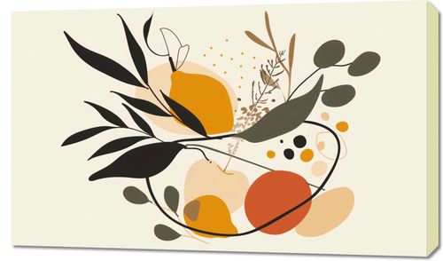 Obraz z serii minimalistyczne zatytułowany Botaniczny Wir. Grafika ta przedstawia elegancką kompozycję stylizowanych elementów roślinnych, które tańczą wśród abstrakcyjnych form i linii. Barwy są ciepłe i przyjemne dla oka, z odcieniami ochry, pomarańczu i czerni, co nadaje dziełu wyjątkową głębię i teksturę. Obraz ten świetnie wpasuje się w przestrzenie, które szukają zarówno spokoju, jak i subtelnej energii. Będzie wyjątkowym dodatkiem do salonów, gabinetów, a nawet jako element wyróżniający w przestrzeniach komercyjnych jak kawiarnie czy butiki. Ożywi wnętrze, zachowując jednocześnie harmonijny i zrównoważony charakter.