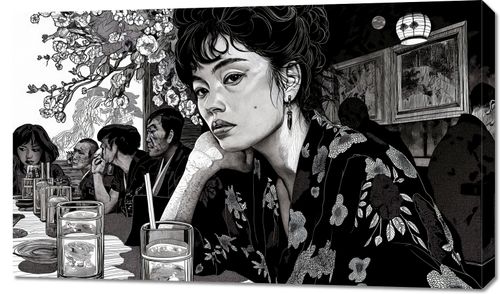 Obraz z serii motywy wschodnie zatytułowany Czarne Kimono. Przedstawia on czarno-białą scenę w restauracji, w której centralną postacią jest młoda kobieta o intensywnym spojrzeniu, ubrana w tradycyjny, kwiecisty kimono. Jej postać wyróżnia się na tle pozostałych gości, a szczegółowa grafika podkreśla wyraźne detale jej stroju i delikatnych rysów twarzy. Tło, zdobione motywem kwiatowym, nadaje głębi i kontekstu kulturowego, a całość kompozycji wywołuje atmosferę introspekcji i spokoju. Ten obraz idealnie nadaje się do wnętrz, które chcą oddać hołd klasycznej estetyce Dalekiego Wschodu lub po prostu wprowadzić element zastanowienia i piękna. Doskonale wpasuje się w przestrzenie takie jak salon, gabinet, a nawet miejsca publiczne, które pragną zapewnić swoim gościom wizualny odpoczynek i chwilę zadumy.