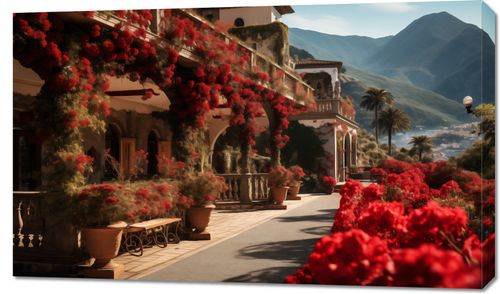 Obraz z serii pejzaże zatytułowany Czerwona Idylla, przedstawia romantyczną scenę otuloną w bujne, kwitnące bougainvillea, które zdobią klasyczną architekturę z widokiem na malownicze wzgórza. Czerwone kwiaty przypominające klejnoty, kontrastujące z ciepłą paletą pastelowych ścian i żywej zieleni, przywołują uczucie wiecznego lata. To arcydzieło znakomicie komponowałoby się w przestronnych, jasnych przestrzeniach, takich jak rezydencje w stylu śródziemnomorskim, ekskluzywne spa czy jako element wyróżniający w eleganckich restauracjach, zapraszając do marzeń o długich, leniwych dniach nad Morzem Śródziemnym.