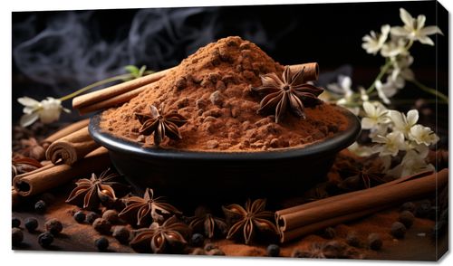 Obraz z serii święta zatytułowany Esencja Aromatu. Mocny akcent na kompozycję przypraw z cynamonem, anyżem i ziarnami pieprzu rozsypanych wokół miski pełnej mielonego cynamonu, tworzący wzór przypominający sztukę natury, wyróżnia się zarówno prostotą, jak i głębią. Delikatny dym unoszący się nad przyprawami dodaje atmosfery ciepła i domowego ogniska. Ten obraz idealnie komponuje się z kuchniami o bogatym, ziemskim wystroju, jak również z eleganckimi restauracjami oferującymi etniczną kuchnię, gdzie podkreśli uczucie przytulności i tradycji.