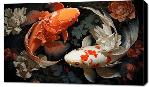 Obraz z serii motywy wschodnie zatytułowany Harmonijny Taniec to arcydzieło, które wyraża subtelność i równowagę przez harmonijne współistnienie natury i sztuki. Dwie ryby koi, jedna w odcieniach płomiennego pomarańczu, druga w pastelowych barwach kremu z akcentami czerwieni, są przedstawione w eleganckim tańcu, który jest tak płynny i gracji jak ruchy baletnicy. Ich delikatne płetwy przypominają falujące tkaniny, unoszące się w wodnym balecie, otoczone przez misternie malowane kwiaty, które dodają całości organicznej głębi. To zmysłowe i prowokujące do refleksji dzieło, które doskonale uzupełni każde wyrafinowane wnętrze, od stylowych kawiarni po intymne przestrzenie prywatne, gdzie design łączy się z naturalnym pięknem.