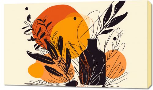 Obraz z serii minimalistyczne zatytułowany Jaskrawy Zachód. Na grafice widnieje silnie stylizowany motyw roślinny, gdzie czarne sylwetki roślin kontrastują z jaskrawo pomarańczowym i żółtym tłem, przypominającym zachodzące słońce. W tle pojawiają się delikatne, abstrakcyjne linie i kształty, dodające kompozycji głębi i tekstury.Ten plakat doskonale wpasuje się w wnętrza ożywione roślinnością, zarówno te domowe, jak i komercyjne przestrzenie typu kawiarnie lub sklepy z roślinami. Jego ciepłe barwy będą wprowadzać przytulną atmosferę i mogą stanowić żywy akcent w przestrzeniach utrzymanych w naturalnej kolorystyce.