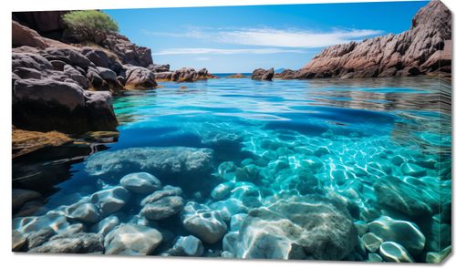 Obraz z serii pejzaże zatytułowany Krystaliczna Woda uchwytuje hipnotyzującą przejrzystość turkusowych wód u wybrzeży skalistej zatoki. Jasne, żywe kolory wody kontrastują z surowymi, ciemnymi odcieniami skał, tworząc obraz, który jest zarówno surowy, jak i oczyszczający. Gra światła pod wodą rysuje zawiłe wzory na kamieniach, przypominając o nieskończonej różnorodności i pięknie naturalnego świata. Ten pejzaż morski doskonale wkomponuje się w przestrzenie pełne naturalnego światła i przestronności, takie jak spa, luksusowe łazienki, czy jasne recepcje hotelowe, gdzie może przynieść odrobinę spokoju i poczucia połączenia z naturą.