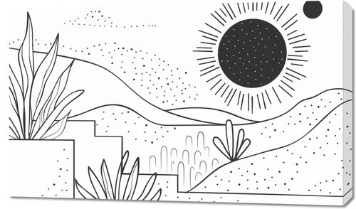 Obraz z serii minimalistyczne zatytułowany Linearny Pejzaż. Obraz przedstawia liniową ilustrację krajobrazu w czerni i bieli, gdzie przestrzeń zapełniają delikatne linie, kropki i abstrakcyjne formy roślinności. Centralnym punktem jest stylizowane słońce z promieniami rozchodzącymi się we wszystkie strony, towarzyszy mu mniejsze ciało niebieskie, które może symbolizować planetę lub księżyc. Lekkie kropki sugerują obecność piasku lub gwiazd, dodając elementu fantazji. Ten obraz wprowadzi do każdej przestrzeni element spokoju i prostoty. Idealnie nadaje się do nowoczesnych przestrzeni, takich jak minimalistyczne biura, jadalnie czy pokoje młodzieżowe, dostarczając neutralnej palety, która pasuje do wielu schematów kolorystycznych i stylów dekoracyjnych.
