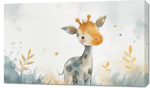 Obraz z serii wnętrza zatytułowany Mała Żyrafka. Uroczy obraz przedstawia młodą żyrafę o łagodnym spojrzeniu, wyłaniającą się z akwarelowej mgły pastelowych barw. Delikatne krople farby i subtelne linie tworzą atmosferę czystości i spokoju, nadając dziełu ciepły i relaksujący nastrój. Ten obraz, emanujący dziecięcą niewinnością i ciekawością świata, będzie idealnym dodatkiem do przestrzeni dziecięcej, takiej jak pokoje maluchów, przedszkola lub miejsca oczekiwania w placówkach pediatrycznych, zachęcając małych i dużych do marzeń i odkrywania piękna przyrody.