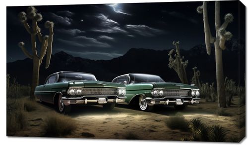 Obraz z serii wnętrza zatytułowany Nostalgiczne Spotkanie ukazuje dwa klasyczne samochody z lat 50., zaparkowane bok w bok pod rozgwieżdżonym nocnym niebem. W tle majestatyczne, ciemne góry rysują się na horyzoncie, a pomiędzy nimi a samochodami rozpościera się dzika pustynna sceneria, z charakterystycznymi kaktusami saguaro. Oświetlone przez delikatne światło księżyca, pojazdy prezentują swoje błyszczące, zadbane karoserie, które odbijają blask gwiazd. Scena ta emanuje spokojem i bezczasowością, przywołując wspomnienia podróży i przygód z minionych epok. Ten obraz doskonale odnajdzie się w przestrzeniach miłośników motoryzacji, retro kawiarniach lub jako elegancki akcent w salonach domowych, inspirując do marzeń o podróży przez historię i amerykański krajobraz.