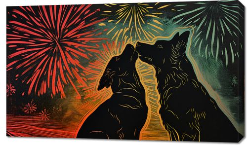 Obraz z serii abstrakcja zatytułowany Psi Uścisk. Przedstawia on dwie sylwetki psów, które wydają się być zwrócone ku sobie w gest podobny do uścisku, na tle intensywnie kolorowego nieba z fajerwerkami. Barwy od czerwieni po żółcie i zielenie tworzą tło, które wygląda jak nocne niebo w trakcie świętowania. Styl graficzny jest dynamiczny i pełen energii, a linie tworzące sylwetki psów są płynne i wyraziste. Ten obraz wyraża radość i nieodłączną więź pomiędzy zwierzętami, będąc doskonałym dodatkiem do wnętrz, gdzie chcemy podkreślić ciepło i pozytywne emocje.