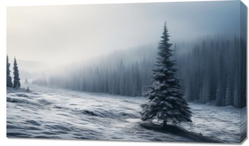 Obraz z serii pejzaże zatytułowany Samotna Choinka. Ta grafika ukazuje malowniczy, zimowy krajobraz z dominującą pojedynczą, okazałą choinką pokrytą śniegiem. Otoczona przez delikatnie zasnutej mgłą lasy, podkreśla spokój i majestatyczną ciszę zimy. Delikatne odcienie błękitu i bieli tworzą wrażenie chłodu i spokoju. Ten obraz będzie idealnym dodatkiem do każdego wnętrza, gdzie chcemy wprowadzić atmosferę spokoju i kontemplacji, świetnie sprawdzi się w przestrzeniach takich jak gabinety relaksacyjne, spa, a także jako element dekoracyjny w domowych salonach lub sypialniach.