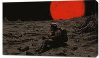 Obraz z serii abstrakcja zatytułowany Samotność w Kosmosie przedstawia astronautę siedzącego na pustkowiu księżycowym, z ogromną czerwoną gwiazdą w tle. Osamotniony kosmonauta wygląda na zamyślonego lub odpoczywającego, otoczony przez surowy, nierówny krajobraz księżycowy, z jego charakterystycznymi kraterami i szczytami. Obraz emanuje głębokim spokojem i izolacją, podkreślając zarówno piękno, jak i nieprzewidywalność przestrzeni kosmicznej. Wyrazisty kontrast między ciemnymi skałami a jaskrawą gwiazdą podkreśla dramatyczną aurę tej sceny. Ten obraz idealnie nadawałby się do dekoracji ścian w domowych biurach lub przestrzeniach edukacyjnych, inspirowanych tematyką kosmiczną.