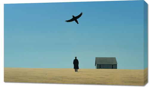 Obraz z serii abstrakcja zatytułowany Samotny i Wolny. Ten spokojny obraz prezentuje postać stojącą na rozległym polu, zwróconą w stronę małego domu i latającego wysoko ptaka. Kompozycja wyróżnia się prostotą i czystością linii, a jej ograniczona paleta barw - złocistych traw, jasnoniebieskiego nieba i ciemnych sylwetek - przyciąga uwagę i wywołuje uczucie spokoju. Obraz symbolizuje kontrast między uczuciem izolacji a pragnieniem wolności, co może być interpretowane na wiele sposobów. Idealny do przestrzeni, które cenią sobie spokój i refleksję, takich jak pokoje do medytacji, minimalistyczne salony, czy współczesne gabinety.