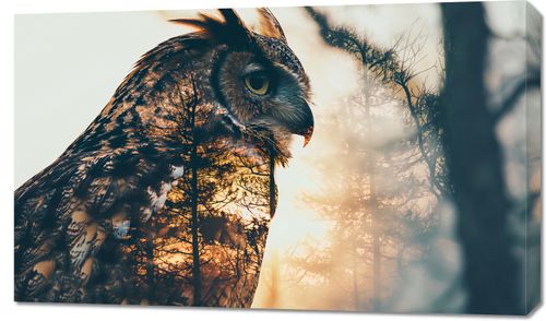 Obraz z serii natura zatytułowany Sowi Duch. Prezentuje on majestatyczną sylwetkę sowy zlewaną z tłem o zachodzie słońca w lesie, co podkreśla jej dziką naturę i instynktowną mądrość. Ciepłe odcienie zachodzącego słońca i sylwetki drzew przenikają się z delikatnym konturem sowy, tworząc wrażenie jedności z naturą. Obraz ten idealnie wpasuje się w przestrzenie takie jak gabinet, biblioteka lub salon, gdzie może inspirować do refleksji i spokoju, przypominając o głębokich, nieodkrytych aspektach natury.