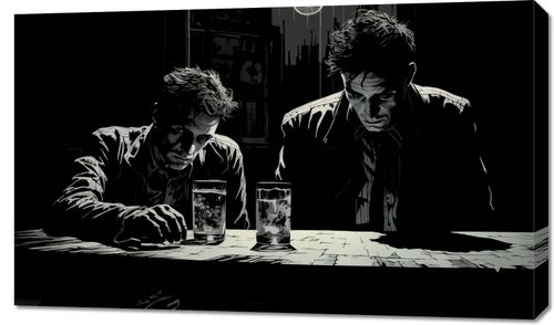 Obraz z serii abstrakcja zatytułowany Spiskowcy. Ta grafika przedstawia dwóch mężczyzn zanurzonych w głębokiej konwersacji przy barowym stole. Stylizacja na czarno-biało uchwyciła napięte, dramatyczne oświetlenie i cienie, które nadają scenie klimat tajemniczości i suspensu. Wyraźne kontury i kontrastowe światłocienie podkreślają wyraziste postaci mężczyzn i ich zacięte postawy. Obraz ten przemawia do miłośników klasycznego kina i literatury, doskonale nadając się do dekoracji przestrzeni o męskim charakterze, takich jak prywatne gabinety, domowe bary czy miejsca spotkań.