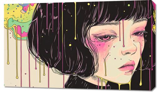 Obraz z serii pop art zatytułowany Strugi Kolorów. Ten hipnotyzujący obraz przedstawia wizerunek młodej kobiety z przymkniętymi oczami, jej twarz zdaje się być na granicy snu i jawy. Nad nią i wokół niej płyną strugi kolorów, które wydają się rozlewać jak ciecz, tworząc atmosferę oniryczną i abstrakcyjną. Kontrast między realistyczną twarzą a surrealistycznym tłem podkreśla emocjonalną głębię i złożoność ludzkich doświadczeń.Obraz ten doskonale uzupełni przestrzeń pełną kreatywności i wyobraźni, taką jak pracownie artystyczne, kawiarnie, czy nawet nowoczesne pokoje młodzieżowe. Może również stanowić niebanalny akcent w pomieszczeniach terapeutycznych lub coachingowych, gdzie rozmowa na temat emocji i wewnętrznego świata jest na porządku dziennym.