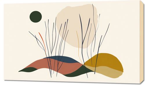 Obraz z serii boho zatytułowany Szept Wiatrów. Grafika przedstawia abstrakcyjny pejzaż, w którym finezyjne, czarne linie wyobrażają łagodnie kołyszące się trawy. Kształty w ciepłych odcieniach ziemi tworzą iluzję wzgórz i ścieżek, a dyskretna zielona kropka w górnym rogu zdaje się być echem oddalającego się słońca lub zapowiedzią zmierzchu. Wszystko to ujęte na tle delikatnego beżu, co nadaje dziełu spokojny, relaksujący nastrój. Obraz ten idealnie wpasuje się w wnętrza, które aspirują do wyciszenia i harmonii z naturą, jak przytulne salony, jadalnie, czy miejsca przeznaczone do medytacji. Może być również pięknym, uspokajającym dodatkiem do biur, bibliotek czy innych przestrzeni wymagających skupienia i spokoju.