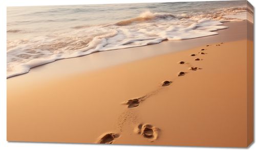 Obraz z serii pejzaże zatytułowany Szepty Fal przedstawia obraz, który zaprasza widza do kontemplacji i refleksji. Delikatne ślady stóp wskazują na cichą obecność, a przytłumione szumy fal i miękki piasek podkreślają uczucie spokoju. Rozmyte kolory zachodu słońca, które malują niebo na niemal nierzeczywiste odcienie pomarańczy i błękitu, wydają się być synonimem spokojnego zakończenia dnia. Ta praca idealnie wkomponuje się w estetykę współczesnych salonów lub pokoi wypoczynkowych, które cenią sobie minimalizm i naturę, a także będzie znakomitym wyborem dla przestrzeni wellness i spa, gdzie harmonia i spokój są kluczowymi elementami.