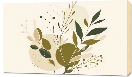 Obraz z serii minimalistyczne zatytułowany Szronowata Barwa. Przedstawia on delikatną kompozycję liści i gałązek w tonacjach zieleni i beżu, na łagodnym tle w pastelowych barwach, z dyskretnymi kropeczkami przypominającymi spokojny deszcz dodając elementu kontemplacji. Ten obraz wprowadzi harmonię i delikatność do każdego pomieszczenia. Jego stonowane kolory i prosta forma doskonale odnajdą się w przestronnych i jasnych wnętrzach, takich jak skandynawskie mieszkania, biura, czy salony spa.