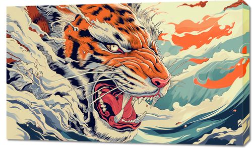 Obraz z serii motywy wschodnie zatytułowany Tygrys Na Fali. Ilustracja przedstawia potężnego tygrysa wyłaniającego się z wzburzonych fal oceanu, z paszczą szeroko otwartą w głośnym ryku. Styl graficzny, z wyrazistymi liniami i żywymi kolorami, przypomina klasyczne azjatyckie sztuki, łącząc w sobie elementy tradycji i nowoczesności. Dynamiczne pociągnięcia pędzlem i kontrastowe kolory podkreślają siłę i dzikość sceny. Obraz ten będzie idealnym akcentem w przestrzeniach, które celebrują energię i życiową siłę, takich jak sale do ćwiczeń, studia artystyczne czy nowoczesne biura.