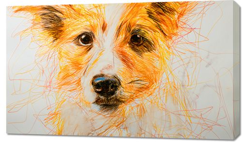Obraz z serii wnętrza zatytułowany Uroczy Gość przedstawia twarz uroczego psa, stworzoną z setek dynamicznych, kolorowych linii. Jego oczy pełne są życia, a ciepła paleta barw, od żółtego po czerwony, nadaje temu dziełu szczególnego ciepła i energii. Szkicowe kreski nie tylko oddają fakturę futra, ale także wibrującą osobowość psa. Ten obraz idealnie sprawdzi się jako uroczy, artystyczny akcent w przestrzeniach takich jak kawiarnie, kliniki weterynaryjne lub domy miłośników zwierząt, dodając im serdeczności i oryginalności.