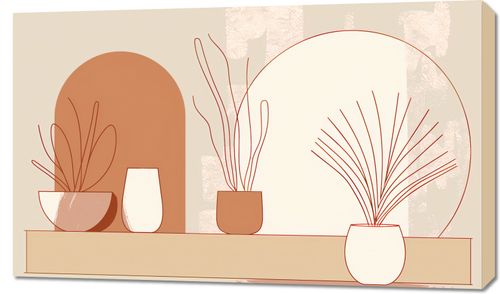 Obraz z serii boho zatytułowany Widok Roślin. Obraz przedstawia trzy stylizowane donice z roślinami, umieszczone na półce w harmonijnym ułożeniu, na tle geometrycznych kształtów w ciepłych, pastelowych kolorach. Proste linie i spokojne barwy tworzą atmosferę relaksu i spokoju, a subtelne tekstury dodają głębi i zainteresowania.Świetnie sprawdzi się w wnętrzach, które cenią sobie spokój i naturalne elementy, takich jak jasne salony, przytulne sypialnie lub miejsca wypoczynku. Jest to idealny wybór dla miłośników minimalizmu i skandynawskiej estetyki.