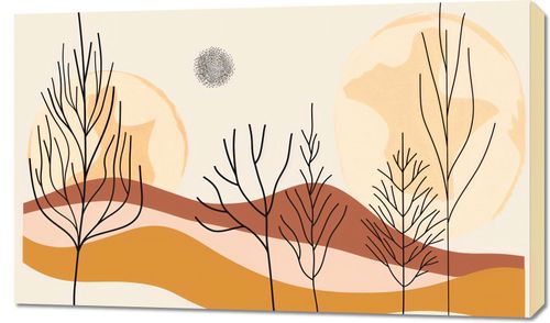 Obraz z serii boho zatytułowany Wydarta Pustynia. Przedstawia on abstrakcyjne, delikatne drzewa na tle pastelowych, organicznych kształtów i ciepłych odcieni zachodu słońca. Subtelna gra kolorów i tekstur tworzy wizję cichej, spokojnej przestrzeni. Różne odcienie i wielkości kolistych form mogą symbolizować słońca lub księżyce, dodając głębi i zainteresowania kompozycji. Ten obraz doskonale odnajdzie się w przestrzeniach, które cenią sobie spokój i harmonię. Jest idealny do dekoracji wnętrz, takich jak salon, sypialnia czy miejsce przeznaczone do medytacji i odpoczynku, oferując delikatne, lecz wyraziste akcenty kolorystyczne.