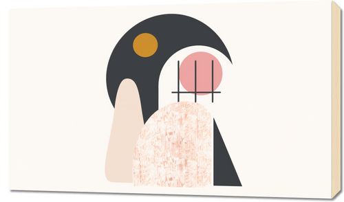 Obraz z serii boho zatytułowany Zakres Widoku.Obraz przedstawia abstrakcyjną kompozycję łączącą kształty zakrzywione i geometryczne, wykorzystującą miękką i spójną paletę kolorów. Dominujące kolory to czarny, odcienie różu, beż oraz akcent żółtego, tworząc poczucie równowagi i nowoczesnej estetyki. Kompozycja składa się z nakładających się form, w tym dużej czarnej figury z wycięciem koła, przez które prześwituje część różowego koła, oraz żółtego koła umieszczonego w obszarze czarnym, co może sugerować ciało niebieskie typu księżyc lub słońce. Obecne są również elementy fakturalne, dodające głębi i intrygi jednemu z kształtów, a proste linie przecinają różowe koło, przyczyniając się do wizualnego zainteresowania dziełem. Całość kompozycji przekazuje spokojne i współczesne wrażenie, prawdopodobnie czerpiąc inspirację z natury i sztuki abstrakcyjnej.