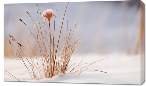Obraz z serii natura, zatytułowany Zima w Detalach. Delikatna kompozycja przedstawiająca trawę i pojedynczy kwiat, które przebijają się przez śnieg, uchwycone w subtelnych, ciepłych tonach o poranku. Subtelne odcienie i miękkość światła nadają temu obrazowi uczucie spokoju i ciszy zimowego krajobrazu. Idealny do wnętrz, które cenią sobie subtelność i naturalność, wnosząc elementy świeżości i czystości zimowego poranka. Doskonale sprawdzi się w salonach, sypialniach, czy przestrzeniach wspólnych, oferując wyciszający efekt wizualny.