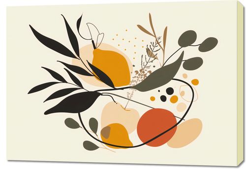 Obraz z serii minimalistyczne zatytułowany Botaniczny Wir. Grafika ta przedstawia elegancką kompozycję stylizowanych elementów roślinnych, które tańczą wśród abstrakcyjnych form i linii. Barwy są ciepłe i przyjemne dla oka, z odcieniami ochry, pomarańczu i czerni, co nadaje dziełu wyjątkową głębię i teksturę. Obraz ten świetnie wpasuje się w przestrzenie, które szukają zarówno spokoju, jak i subtelnej energii. Będzie wyjątkowym dodatkiem do salonów, gabinetów, a nawet jako element wyróżniający w przestrzeniach komercyjnych jak kawiarnie czy butiki. Ożywi wnętrze, zachowując jednocześnie harmonijny i zrównoważony charakter.