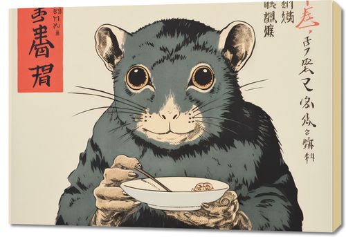 Obraz z serii motywy wschodnie zatytułowany Chwila Refleksji. Intrygujące spojrzenie gryzonia w tradycyjnym stroju, podkreślane przez błękitną tunikę i precyzyjne detale, które nadają mu humanoidalnego charakteru. Czerwone naczynia oraz kanji w tle kontrastują z jasnymi barwami obrazu, dodając nuty głębi i dziedzictwa kulturowego. Subtelna gra światła i cienia na stoliku z jedzeniem i napojem wzbogaca kompozycję i zachęca do refleksji nad połączeniem tradycji z nowoczesnością. Świetnie sprawdzi się w kawiarniach o azjatyckim klimacie, galeriach sztuki oraz w przestrzeniach dedykowanych kulturze Wschodu.