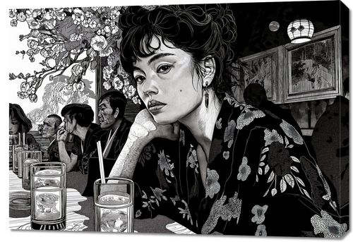 Obraz z serii motywy wschodnie zatytułowany Czarne Kimono. Przedstawia on czarno-białą scenę w restauracji, w której centralną postacią jest młoda kobieta o intensywnym spojrzeniu, ubrana w tradycyjny, kwiecisty kimono. Jej postać wyróżnia się na tle pozostałych gości, a szczegółowa grafika podkreśla wyraźne detale jej stroju i delikatnych rysów twarzy. Tło, zdobione motywem kwiatowym, nadaje głębi i kontekstu kulturowego, a całość kompozycji wywołuje atmosferę introspekcji i spokoju. Ten obraz idealnie nadaje się do wnętrz, które chcą oddać hołd klasycznej estetyce Dalekiego Wschodu lub po prostu wprowadzić element zastanowienia i piękna. Doskonale wpasuje się w przestrzenie takie jak salon, gabinet, a nawet miejsca publiczne, które pragną zapewnić swoim gościom wizualny odpoczynek i chwilę zadumy.
