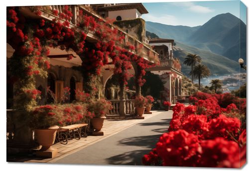 Obraz z serii pejzaże zatytułowany Czerwona Idylla, przedstawia romantyczną scenę otuloną w bujne, kwitnące bougainvillea, które zdobią klasyczną architekturę z widokiem na malownicze wzgórza. Czerwone kwiaty przypominające klejnoty, kontrastujące z ciepłą paletą pastelowych ścian i żywej zieleni, przywołują uczucie wiecznego lata. To arcydzieło znakomicie komponowałoby się w przestronnych, jasnych przestrzeniach, takich jak rezydencje w stylu śródziemnomorskim, ekskluzywne spa czy jako element wyróżniający w eleganckich restauracjach, zapraszając do marzeń o długich, leniwych dniach nad Morzem Śródziemnym.