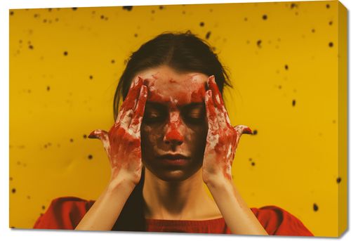 Obraz z serii abstrakcja zatytułowany Dotyk Ekspresji Własnej. Ten mocny wizualnie obraz przedstawia twarz kobiety z zamkniętymi oczami, z dłońmi pokrytymi czerwoną farbą opartymi na skroniach, co może symbolizować intensywność emocji, twórcze natchnienie lub ciężar myśli. Tło w jaskrawym żółtym kolorze, posypane czarnymi kropkami, dodaje energii i kontrastu, podkreślając dramatyzm i głębię sceny. Obraz ten może być interpretowany wielowymiarowo, nadając się do przestrzeni artystycznych, takich jak galerie, pracownie malarskie, a także jako wyraziste uzupełnienie nowoczesnego, miejskiego wnętrza.