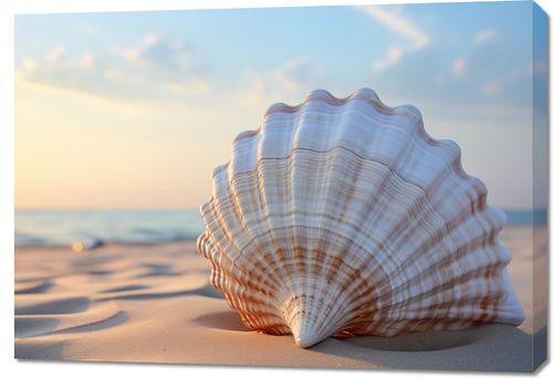 Obraz z serii natura zatytułowany Echo Morza. Delikatne, pastelowe barwy muszli występujące na pierwszym planie, z jej wyraźnymi liniami i subtelnym przejściem kolorów od kremowego do różowego, kontrastują z dynamicznym tłem zachodzącego słońca nad morzem. Złote refleksy światła na wodzie i miękki, piaskowy pierwszy plan tworzą poczucie głębi i spokoju. Idealny do wnętrz o tematyce morskiej, relaksacyjnych spa oraz jako element dekoracyjny w pokojach hotelowych z widokiem na morze.