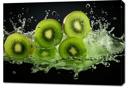 Obraz z serii wnętrza zatytułowany Energia Kiwi, przedstawia dynamiczny moment, gdy plasterki kiwi wchodzą w interakcję z rozpryskującą się wodą, tworząc wizualne spektakulum koloru i ruchu. Jasne zielenie owoców są wyraziste na tle ciemnego tła, a przezroczyste krople wody dodają kompozycji poczucia świeżości. Ten obraz przyciąga uwagę żywiołowością i świeżością, doskonale wpasowując się do przestrzeni, które pragną podkreślić zdrowy styl życia, takich jak kuchnie, jadalnie, studia fitness, spa, a także jako energetyzujący akcent w nowoczesnych biurach lub kawiarniach.