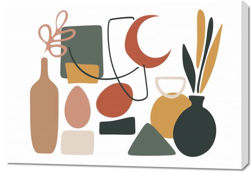 Obraz z serii minimalistyczne zatytułowany Formy Wyzwolone. Grafika składa się z zestawu prostej, ale wyrafinowanej kolekcji kształtów i form w przyjemnej, stonowanej palecie kolorów, z akcentami w odcieniach pomarańczu, zieleni, beżu i czerni. Elementy takie jak butelki, wazony i rośliny są przedstawione w sposób uproszczony, lecz stylowy, z nutą abstrakcyjnego charakteru. Obraz ten świetnie wkomponuje się w nowoczesne i artystyczne przestrzenie, takie jak designerskie biura, minimalistyczne salony, a nawet awangardowe galerie. Z jego pomocą można łatwo wprowadzić graficzną równowagę do wnętrza, zachowując przy tym lekkość i nowoczesność estetyki. Idealnie pasuje do miejsc, gdzie chce się podkreślić indywidualizm i miłość do sztuki.