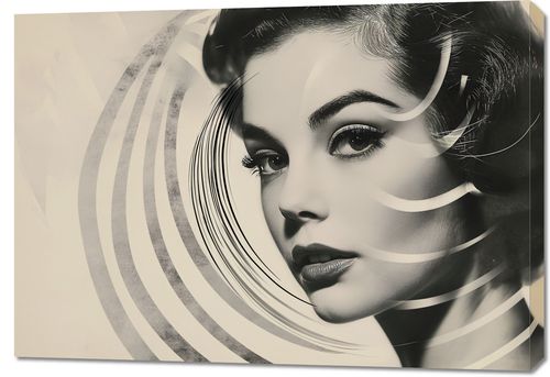 Obraz z serii pop art zatytułowany Ikonka Kina. Przedstawia czarno-białe portretowe zdjęcie klasycznej gwiazdy filmowej, której twarz jest częściowo zakryta przez geometryczny wzór spiralnych linii. Linie te dodają obrazowi dynamiki i nowoczesnego akcentu, kontrastując z retro estetyką portretu. Ten obraz łączy stare z nowym, sugerując zarówno ponadczasową piękność, jak i współczesne spojrzenie na sztukę. Idealny do eleganckich, miejskich przestrzeni lub jako dekoracja dla miłośników klasycznego kina.