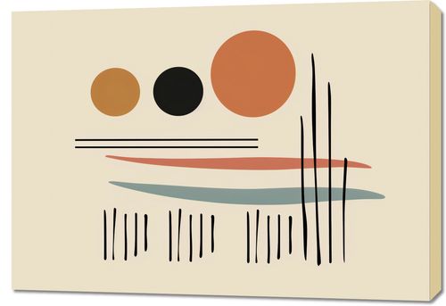 Obraz z serii boho zatytułowany Iluzja Horyzontu.Obraz to zestawienie geometrycznych kształtów i linii, które razem tworzą abstrakcyjny krajobraz. Okręgi w ciepłych odcieniach złota, pomarańcza i czerni sugerują wschodzące lub zachodzące słońce, a pionowe linie mogą przypominać wysokie trawy lub cienie drzew. Poziome pasy w różnych kolorach tworzą iluzję horyzontu, nadając kompozycji głębi i równowagi. Dzieło to wprowadzi do każdego wnętrza element spokoju i kontemplacji. Jest idealne dla przestrzeni, które cenią prostotę i abstrakcję, takich jak nowoczesne salony, minimalistyczne przestrzenie robocze, czy jako element dekoracyjny w pomieszczeniach oczekujących.