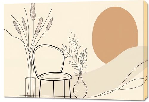 Obraz z serii boho zatytułowany Kącik Spokoju. Obraz prezentuje delikatny, linearny rysunek wnętrza, gdzie w centrum znajduje się eleganckie krzesło umieszczone obok stolika z wazonem i wysokimi, smukłymi roślinami. W tle, duża, okrągła forma w ciepłym, terra-cotta kolorze nadaje całości miękkiego, przytulnego charakteru. Linearna, subtelna paleta barw oraz gra cieni i światła tworzy atmosferę relaksu i wyciszenia. Ten obraz będzie doskonałym wyborem do dekoracji wnętrza, które ma być przestrzenią do odpoczynku i regeneracji. Jego prostota i elegancja sprawią, że doskonale odnajdzie się w salonach, pokojach do czytania, gabinetach czy medytacyjnych kącikach, wprowadzając spokojny i zbalansowany nastrój.