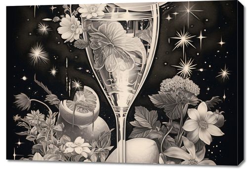 Obraz z serii wnętrza zatytułowany Kosmiczny Eliksir. Niesamowita kompozycja przedstawiająca kieliszek, z którego wylewa się galaktyczny nektar, otoczony kwiatami i roślinami w monochromatycznych barwach. Centralnym punktem jest lśniąca pełnia księżyca, której blask odbija się w szkle, tworząc atmosferę tajemnicy i magii. Gwiazdy migoczą w tle, nadając całości głębokiego, nieskończonego wymiaru. Delikatne linie i szczegóły graficzne wzbogacają kompozycję, czyniąc ją idealnym wyborem do nowoczesnych salonów, galerii sztuki oraz miejsc o tematyce astronomicznej.