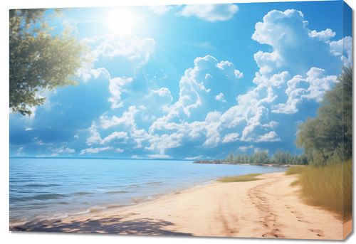 Obraz z serii pejzaże, zatytułowany Letni Dzień. Jasne słońce świecące przez delikatne chmury na błękitnym niebie, plaża z miękkim, złocistym piaskiem oraz przybrzeżne trawy łagodnie kołysane przez letni wiatr tworzą obraz pełen ciepła i spokoju. Ten pejzaż przynosi uczucie relaksu i beztroski, idealne dla tych, którzy chcą przynieść do swojego domu atmosferę wakacyjnego odpoczynku. Doskonale nadaje się do salonów, przestrzeni wypoczynkowych oraz pomieszczeń, gdzie chcemy wprowadzić elementy natury i świeżości.