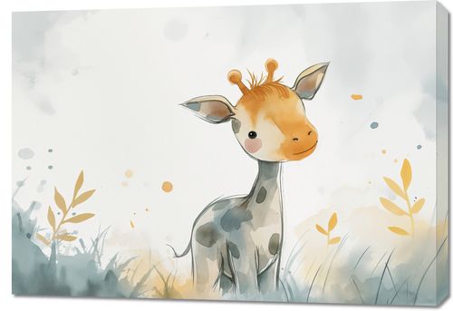 Obraz z serii wnętrza zatytułowany Mała Żyrafka. Uroczy obraz przedstawia młodą żyrafę o łagodnym spojrzeniu, wyłaniającą się z akwarelowej mgły pastelowych barw. Delikatne krople farby i subtelne linie tworzą atmosferę czystości i spokoju, nadając dziełu ciepły i relaksujący nastrój. Ten obraz, emanujący dziecięcą niewinnością i ciekawością świata, będzie idealnym dodatkiem do przestrzeni dziecięcej, takiej jak pokoje maluchów, przedszkola lub miejsca oczekiwania w placówkach pediatrycznych, zachęcając małych i dużych do marzeń i odkrywania piękna przyrody.