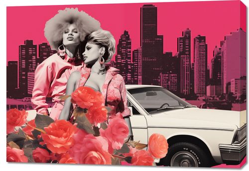Obraz z serii pop art zatytułowany Metropolitalne Divy. Ta stylowa kompozycja łączy dynamikę miejskiego życia z vintage glamour, prezentując dwie kobiety w modnych strojach w tonacji różu, które emanują siłą i elegancją. Ich fryzury i dodatki nawiązują do lat 70. i 80., wprowadzając do obrazu powiew nostalgi. W tle widoczne są charakterystyczne dla wielkiego miasta sylwetki drapaczy chmur, wszystko utrzymane w wyrazistej, różowej kolorystyce, która nadaje plakatowi wyjątkowego charakteru. Na pierwszym planie, między postaciami, widnieje klasyczny samochód i bujny kwiat róż, dodający kompozycji romantycznej aury. Idealny dla wnętrz inspirowanych modą retro oraz dla miłośników miejskiego sznytu.