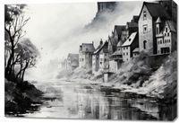 Obraz z serii pejzaże zatytułowany Mglisty Refleks. Misterne pociągnięcia pędzla przedstawiają starą wieś schowaną w mrocznych zakątkach gór, z dominującymi wieżami kościoła wznoszącymi się nad nią. Mgła otulająca krajobraz i odbicie w spokojnej wodzie tworzą atmosferę tajemniczości i zadumy. Monochromatyczna paleta barw dodaje głębi i intensywności całemu obrazowi, czyniąc go idealnym wyborem dla klasycznych salonów oraz miejsc takich jak kawiarnie o historycznym charakterze czy ekskluzywne kluby dyskusyjne.