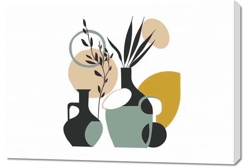 Plakat z serii minimalistyczne zatytułowany Modernistyczna Kompozycja. Grafika ta przedstawia stylizowane wazony w tonacjach czerni i zgaszonego zielonego, wypełnione abstrakcyjnymi roślinami. Tło tworzy gra geometrycznych kształtów i pastelowych barw, takich jak beż i musztardowy, co nadaje całości współczesnego, a zarazem ponadczasowego wygląduIdealnie pasowałby do wnętrz utrzymanych w duchu współczesnego minimalizmu, takich jak nowoczesne salony, minimalistyczne biura, czy loftowe przestrzenie. Świetnie sprawdziłby się również jako akcent w przestrzeniach, gdzie dominuje surowy beton lub eksponowane są naturalne elementy, takie jak drewniane belki czy ceglane ściany. Dzięki swojej prostocie i elegancji, plakat może stać się subtelnym, ale wyraźnym elementem dekoracyjnym.