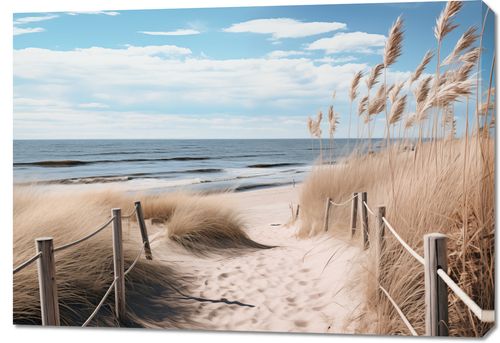 Obraz z serii pejzaże zatytułowany Nadmorski Most to tytuł tej zapierającej dech w piersiach ilustracji, która przemawia do duszy miłośnika morza. Delikatne trawy morskie tańczą w rytmie przybrzeżnego wiatru, a spokojne fale delikatnie docierają do złocistego piasku, tworząc melodię naturalnego spokoju. Nieskazitelnie błękitne niebo przechodzące w pastelowe odcienie na horyzoncie dodaje głębi i przestrzeni, tworząc obraz idealny do umieszczenia w przestrzeniach, które celebrują ciszę i kontemplację. Ten obraz będzie wyjątkowym dodatkiem do każdej plażowej chaty, salonu nadmorskiego domu, a nawet biura, przypominając o nieskończonej przestrzeni i wolności, jaką oferuje morze.