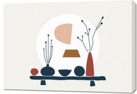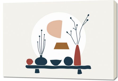 Obraz z serii boho zatytułowany Naturański Stół. Obraz to subtelna i uporządkowana prezentacja natury w stylizowanej, niemal scenicznej formie. Abstrakcyjne kształty w ciepłych i stonowanych kolorach przedstawiają wazony i rośliny na tle geometrycznych form przypominających wschód i zachód słońca. Kompozycja na neutralnym tle łączy sztukę z naturą w spójnym, współczesnym stylu. Dzieło to będzie idealnym uzupełnieniem wnętrz, w których ceniona jest prostota, ale jednocześnie szukających ciepła i naturalności. Może znaleźć miejsce w domowych salonach, jadalniach, lub jako urokliwy element w przestrzeniach biurowych, wniosąc odrobinę uroku i artystycznego nastroju.