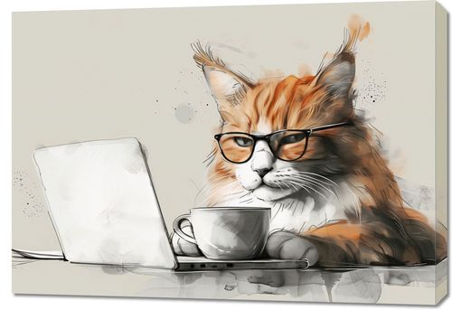 Obraz z serii abstrakcja zatytułowany Nie przed Kawusią. Przedstawia uroczy obraz kota o rudym umaszczeniu, który nosi okulary i wydaje się być zaczytany w ekranie laptopa. Scena jest przedstawiona w ciepłych, nasyconych barwach, które podkreślają miękkość i puszystość futra kota. Elementy graficzne, takie jak plamy i rozpryski farby, nadają kompozycji artystycznego charakteru. Filiżanka kawy umieszczona obok laptopa dodaje codziennej atmosfery, sugerując, że może to być obrazek z domowego biura lub miejsca relaksu. Ten obraz mógłby być idealnym elementem dekoracyjnym dla miłośników kotów i tych, którzy cenią sobie humor oraz lekkość w aranżacji swojego wnętrza, zarówno w domowym biurze, jak i w przestrzeni wypoczynkowej.
