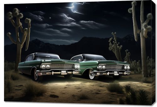 Obraz z serii wnętrza zatytułowany Nostalgiczne Spotkanie ukazuje dwa klasyczne samochody z lat 50., zaparkowane bok w bok pod rozgwieżdżonym nocnym niebem. W tle majestatyczne, ciemne góry rysują się na horyzoncie, a pomiędzy nimi a samochodami rozpościera się dzika pustynna sceneria, z charakterystycznymi kaktusami saguaro. Oświetlone przez delikatne światło księżyca, pojazdy prezentują swoje błyszczące, zadbane karoserie, które odbijają blask gwiazd. Scena ta emanuje spokojem i bezczasowością, przywołując wspomnienia podróży i przygód z minionych epok. Ten obraz doskonale odnajdzie się w przestrzeniach miłośników motoryzacji, retro kawiarniach lub jako elegancki akcent w salonach domowych, inspirując do marzeń o podróży przez historię i amerykański krajobraz.
