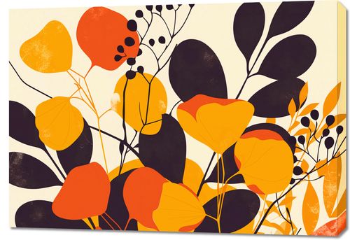 Obraz z serii minimalistyczne zatytułowany Ogrodowa Paleta. Na tej grafice dominują roślinne motywy z wyraźnymi konturami na tle pastelowych barw. Intensywne odcienie czerwieni, pomarańczy i żółci przeplatają się z głębokimi czerniami i złocistymi akcentami, tworząc bogaty, lecz harmonijny obraz.Ten obraz znajdzie swoje miejsce w przestrzeniach, gdzie kolor i życie są celebrowane. Z powodzeniem ozdobi ściany kreatywnych biur, eklektycznych salonów czy przytulnych zakątków domu. Jego energetyzujące barwy wniosą ciepło i radość do każdego wnętrza, jednocześnie będąc odważnym akcentem w bardziej stonowanych dekoracjach.